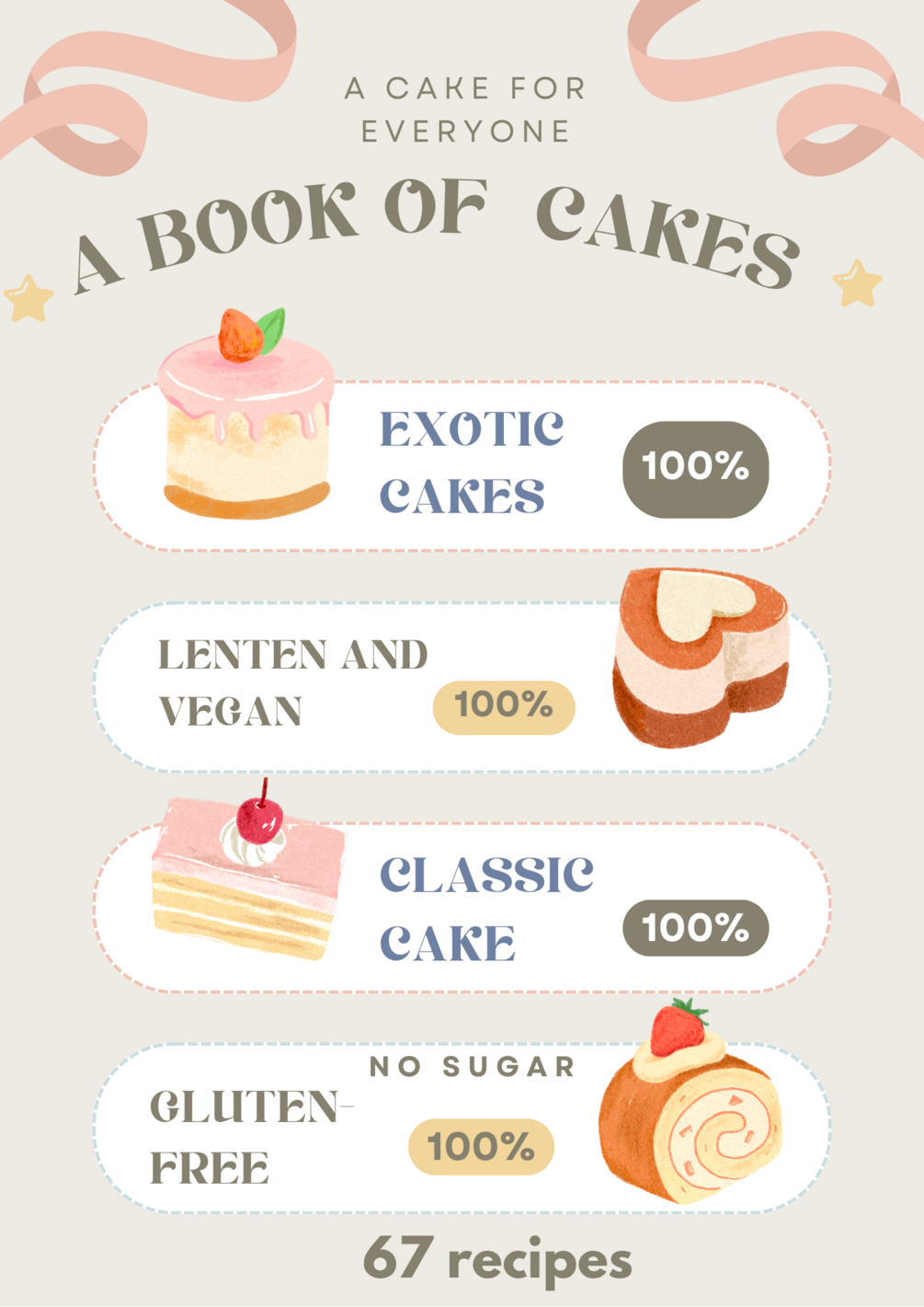 "Indulge your sweet tooth and embark on a delightful culinary journey with our meticulously curated collection of cake recipes. From classic favorites to exotic creations inspired by flavors from around the globe, this comprehensive cookbook offers something to satisfy every craving and occasion. Whether you're a novice baker or a seasoned pastry chef, each recipe is expertly crafted with easy-to-follow instructions and tips to ensure perfect results every time. With tantalizing photographs and mouthwatering descriptions, this book not only provides a treasure trove of delectable treats but also serves as a source of inspiration for baking enthusiasts of all skill levels. Whether you're craving a rich and decadent chocolate cake, a light and fluffy sponge cake, or a refreshing fruit-infused delight, our collection has it all. Indulge in the joy of baking and create unforgettable memories with friends and family as you explore the world of cakes through our irresistible 67 recipes."